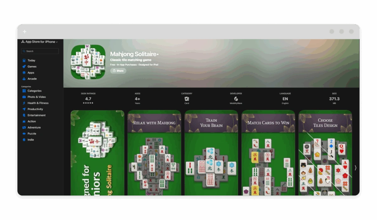 Mahjong Solitaire features relaxing tile-matching with themes like flowers and animals, plus hints for stuck boards. Seniors love it for the therapeutic matching that improves pattern recognition and focus, with adjustable difficulty and large tiles that ease visual strain without overwhelming complexity. The slow-paced gameplay encourages patience and strategic thinking, helping combat cognitive decline while providing a calming activity that can be paused and resumed easily, ideal for those with varying energy levels.