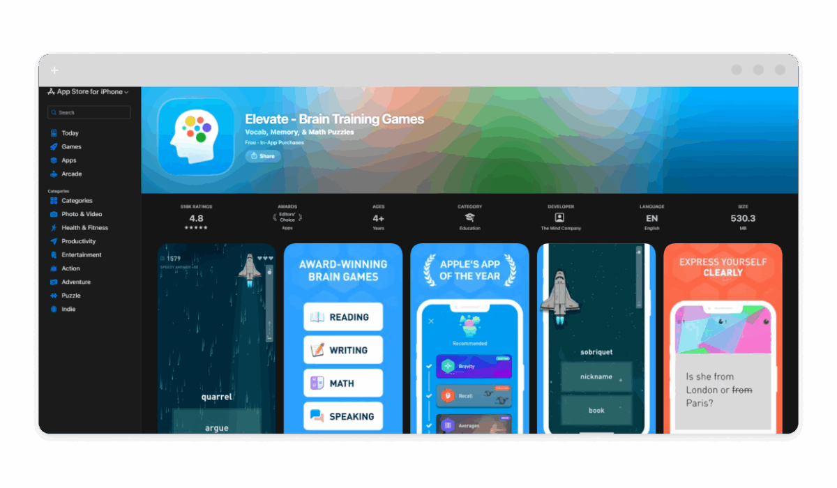 Elevate sharpens reading, math, and speaking with adaptive daily workouts. Seniors benefit from its short, focused sessions that build confidence in everyday skills like calculation or comprehension, with progress graphs motivating continued play. The app’s clear visuals and audio cues make it accessible for those with hearing or vision limitations, supporting independence in tasks like managing finances or reading news.