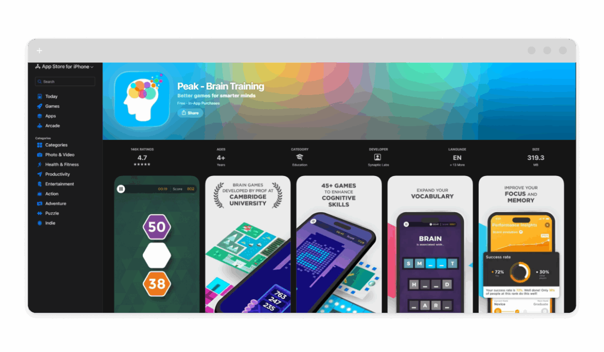 Peak offers mini-games for memory, language, and problem-solving with leaderboards. It’s suited for seniors as the bite-sized challenges fit short attention spans, with exercises backed by neuroscience to improve focus and agility. The app’s gentle progression and reminders encourage regular use, helping maintain mental sharpness for activities like driving or hobbies.