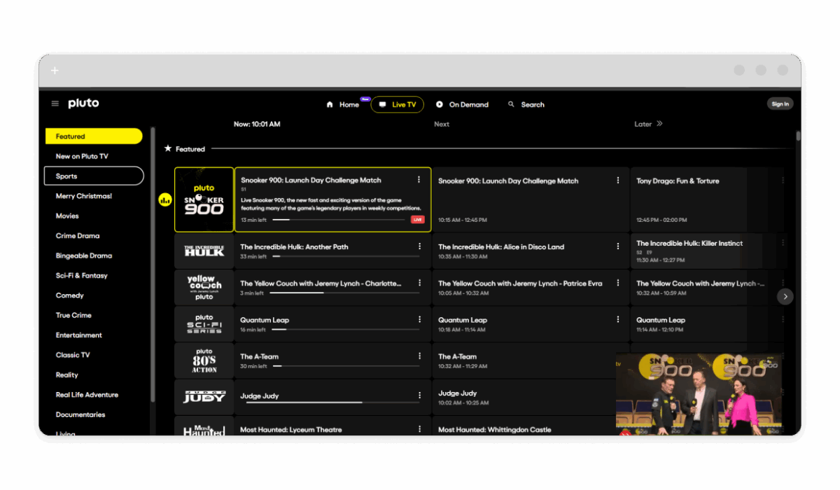 Viacom’s FAST channel aggregator, delivering 24/7 sports blocks without signup walls.