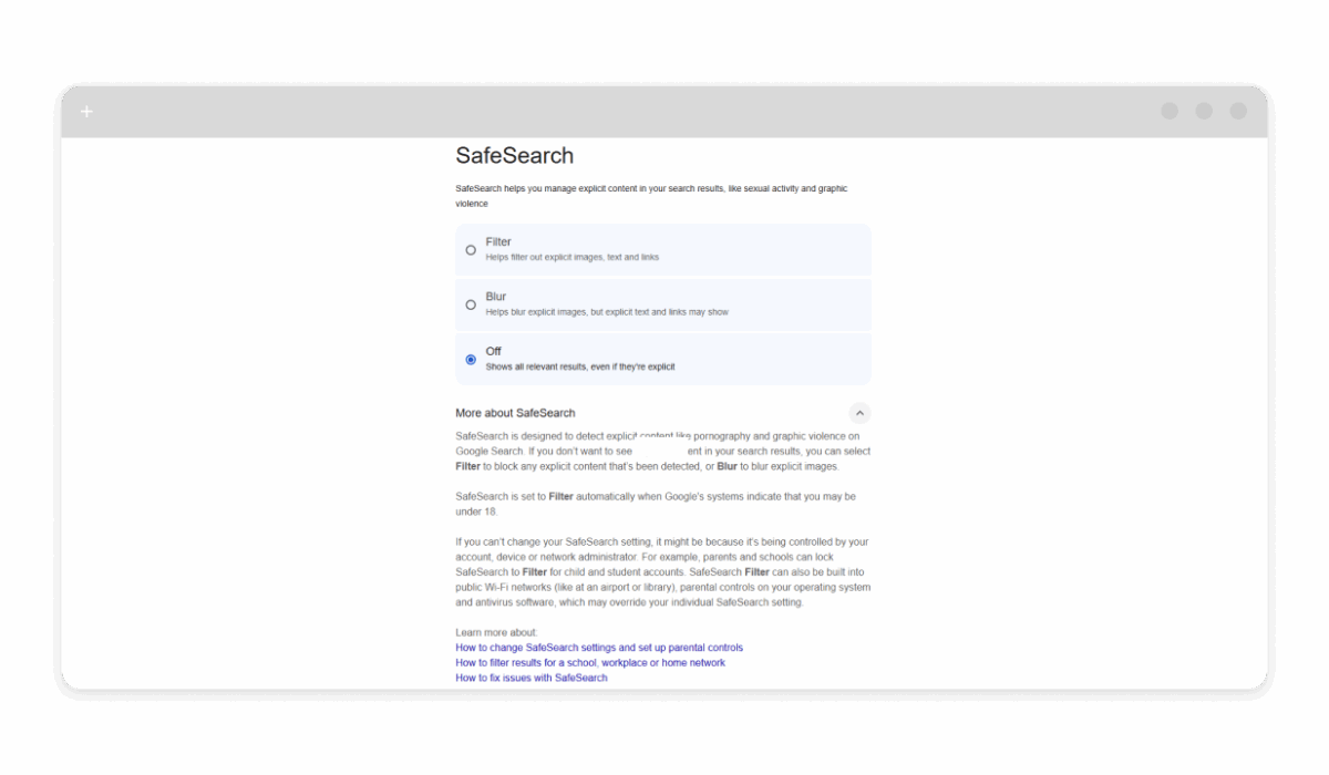 - Turn on SafeSearch to filter out explicit images, videos, and websites;