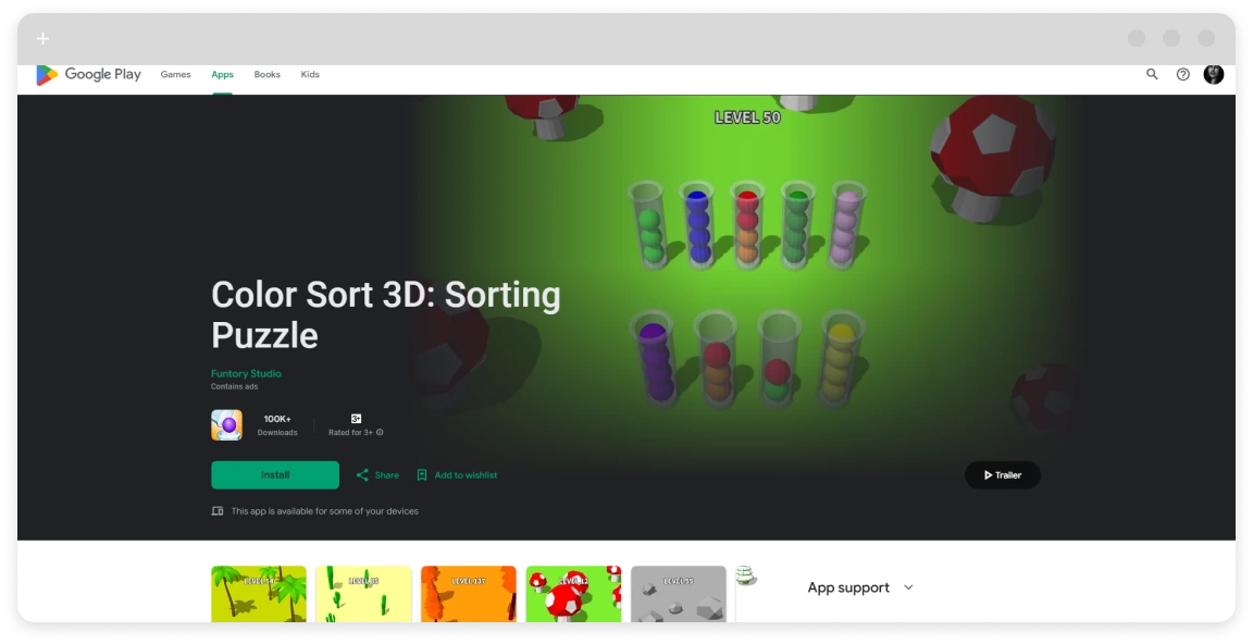 - User feedback: “The 3D version is so calming — finally an ad-free sorting game that looks beautiful” (4.9 stars).