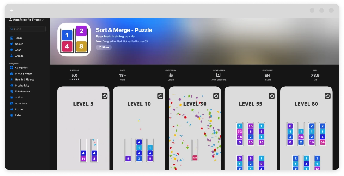 - Why it’s great: The merge + sort combination keeps the brain engaged longer than standard sorting games.