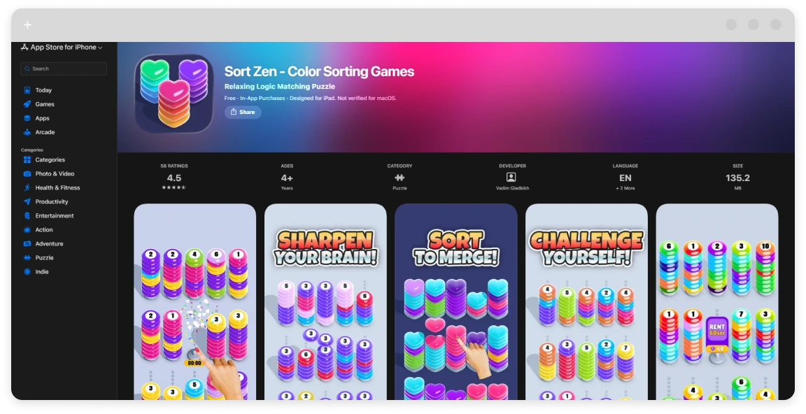 - User feedback: “The most peaceful sorting game I’ve ever played — zero ads” (4.9 stars).