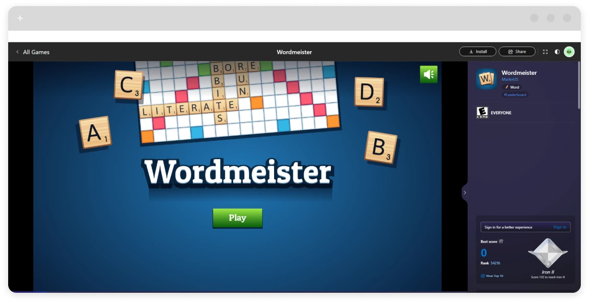 | Wordmeister | Browser | Scrabble-like game against AI opponents. | Clean interface, no signup needed. |